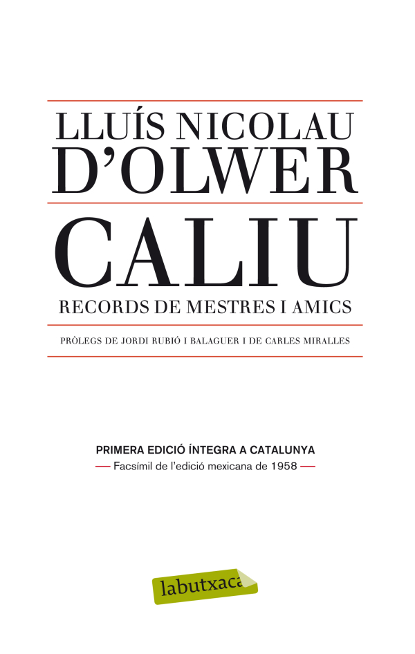Caliu és un conjunt de quinze retrats de personalitats essencials de la vida política i cultural catalana de la primera meitat del segle xx. Lluís Nicolau d'Olwer, ell mateix una personalitat imprescindible, hi evoca mestres i amics, des de Verdaguer i Rubió i Lluch fins a Macià i Companys. Tot i ser un llibre d'un interès vivíssim, ple a estones d'una enorme emoció i sempre d'una alta qualitat literària, aquest és el primer cop que es publica a Catalunya. Perquè aquesta edició reprodueix, en facsímil, l'única edició íntegra del volum, apareguda a Mèxic el 1958. Quan es va editar el 1973 a la Biblioteca Selecta, la censura franquista va obligar a suprimir-ne nombrosos passatges i quatre capítols sencers: els dedicats a Francesc Layret, Francesc Macià, Carles Rahola i Lluís Companys.