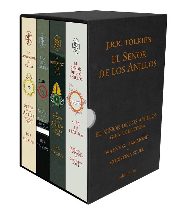 Para celebrar el sesenta aniversario de esta obra clave de la literatura universal, Minotauro presenta un estuche de lujo que contiene los tres volúmenes de El Señor de los Anillos con las sobrecubiertas que diseñó Tolkien para la primera edición, y el volumen El Señor de los Anillos: Guía de lectura, en el que los expertos en Tolkien, Wayne G. Hammond y Christina Scull, analizan la obra capítulo a capítulo a través de reflexiones acerca de su evolución, estructura y significado. Este impresionante volumen también contiene una breve historia de El Señor de los Anillos, un listado de los errores e inconsistencias corregidos en esta edición y la Nomenclatura o guía de nombres que Tolkien puso a disposición de los traductores y que había permanecido inédita en castellano hasta la fecha.